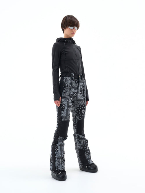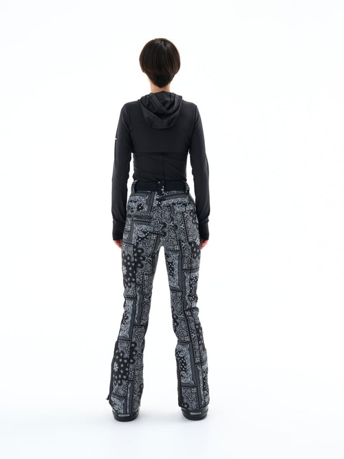 All over printed flared pant with an adjustable velcro and elstic waist designed for a slim fit. This pant is made from approx 10k waterproof rated, Recycled breathable 1fabrication, Offering a waterprrof and windproof body and has added heat-sealed seams for protection and duribility. The built-in knee pads, Snow guard at the bottom hem and adjustable shoulder straps offer the right support and protection to make it ideal for long days on the slopes.