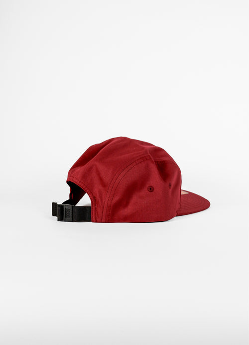 This structured 5-panel cap features a high-profile crown, durable cotton twill fabric, a flat bill, and a woven nylon strapback closure for a secure, adjustable fit.