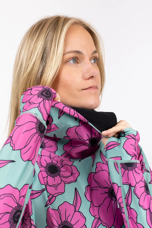 Be extra toasty in our purple printed sports base layer that combines streetfashion and maxed out functionality. The extended back and the integrated soft and fleece lined gaiter neckwarmer cut higher in the back to easily tuck it under the helmet or beanie for extra warmth, protects you on cold winter days trhough every weather. Stay comfortable through cold mountain days, outdoor adventures, or even a calm moment in the yoga studio.